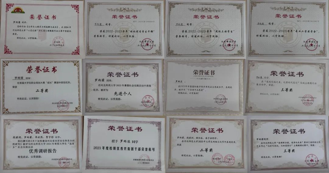 投身志愿服务,解锁成长密码。罗雨濛积极参与校内外各类志愿服务,用实际行动传递爱心,践行奉献精神。志愿时长累计296小时,曾在2023年中国国际数字经济博览会担任志愿者,对接世界500强企业京东方党委书记冯强先生,圆满完成一对一接待嘉宾组任务,获2023年石家庄市十佳青年志愿者称号。深入基层调研,助力乡村发展。她积极参与社会实践,2023年12月至2024年7月,她所在的琢玉队前往河北省5个典型和美乡村,围绕如何建设宜居宜业和美乡村展开实地调研,撰写出一篇5万余字的调研报告。2024年,琢玉实践队入选全国大学生“乡村振兴・青春笃行”计划实践队,且获x站 暑期社会实践优秀团队称号。她连续两年被评为x站 暑期社会实践先进个人,参与撰写的调研报告获2024年x站 寒假大学生“返家乡”社会实践活动优秀调研报告、2024年x站 暑期社会实践优秀调研报告。